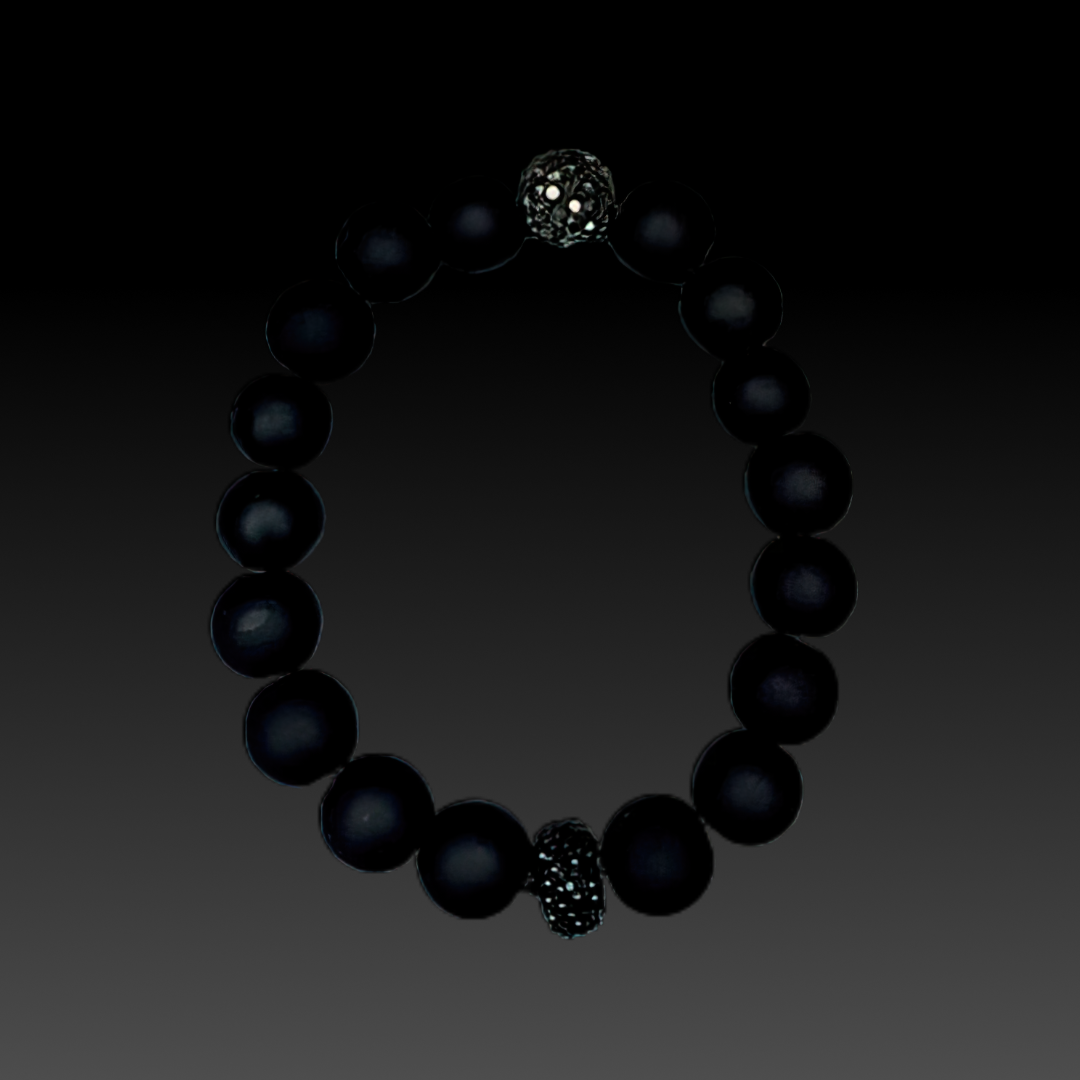 Black glass beads, rhinestone black disco ball, & black resin rondelle bead. The bead size is 10 mm. Each design is for men or women.